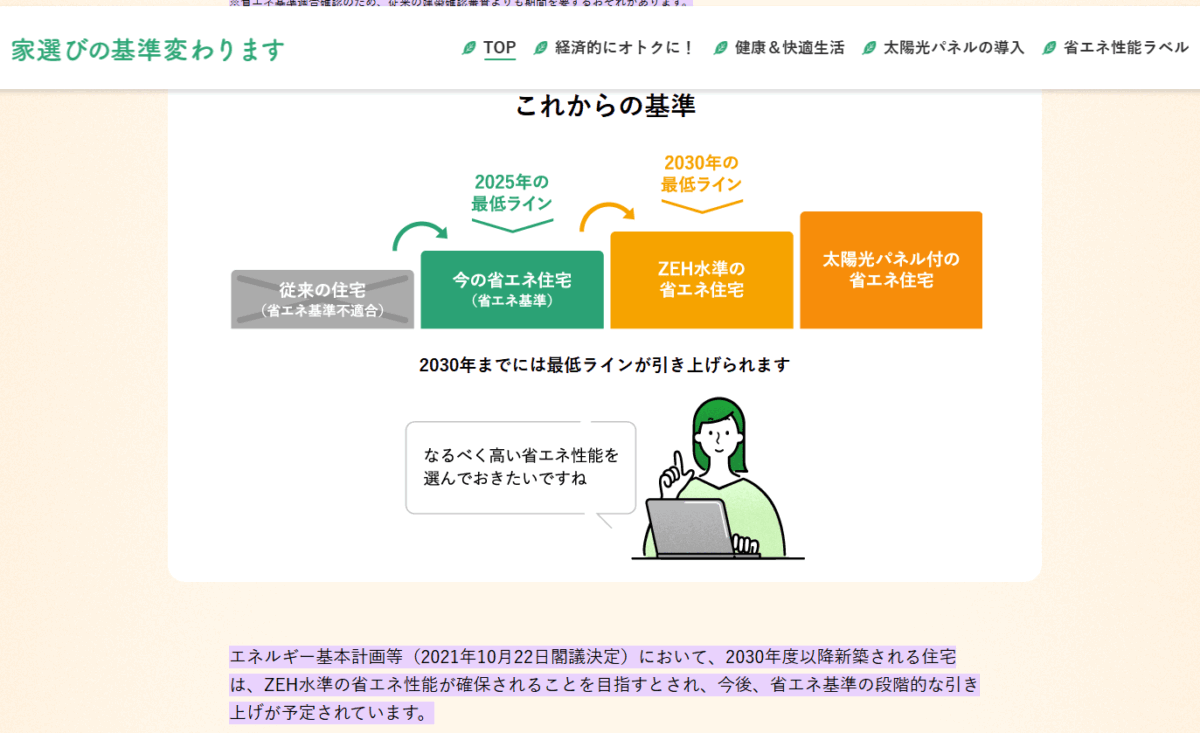 かつ、省エネ基準適合住宅(断熱等級4の住宅)には注意が必要で、2030年以降はZEH基準(断熱等級5)が最低基準となり、省エネ基準適合住宅(断熱等級4の住宅)そのものが新築としては建てられなくなる予定です。