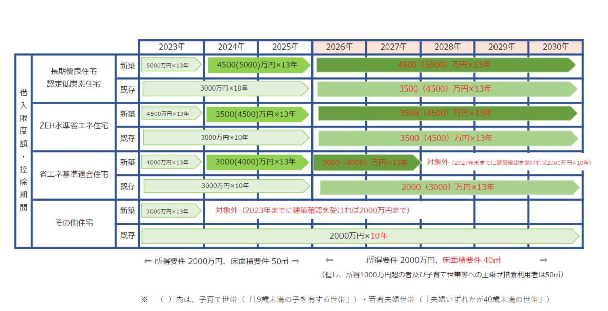 さらに、令和10年以降の入居から、立地要件が加えられた点も注意すべき点です。令和10年以降にご入居の場合、土砂災害等の災害レッドゾーン(※)の新築住宅は適用対象外とされます(建替え・既存住宅・リフォームは適用対象です)。