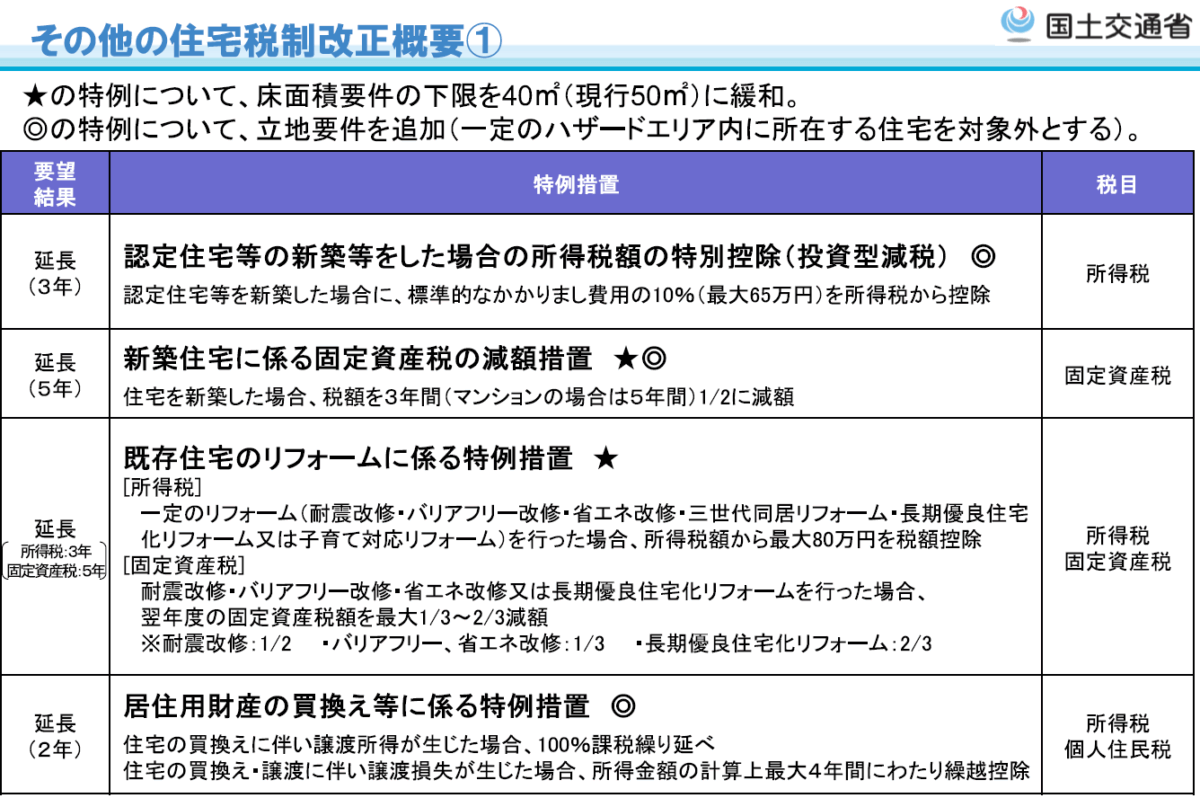 国土交通省発表の文書をそのまま添付しますが、ほとんどの優遇税制が延長か拡充となっています。但し、40㎡と床面積要件が緩和される一方で、一定のハザードエリアに所在する場合は対象外となる立地要件を追加されたものもありますので、ぜひご自身が対象となる可能性のある税制は詳細をご確認ください。