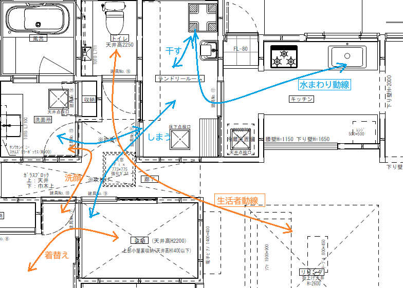 弊社が作成したオリジナルな間取りの中で、水回り動線が特徴的な2種の間取りの一部をご紹介させていただきます。どちらも平屋ですが、共働きの子育て世代であるか、リタイア後のご夫婦の暮らしを中心とした間取りであるかでかなり異なります。